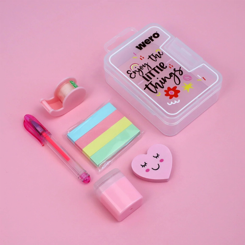 SET PARA ESCRITORIO MINI THING (CINTA ADHESIVA CON DISPENSER-SACAPUNTA-GOMA-ROLLER-NOTAS ADHESIVAS)